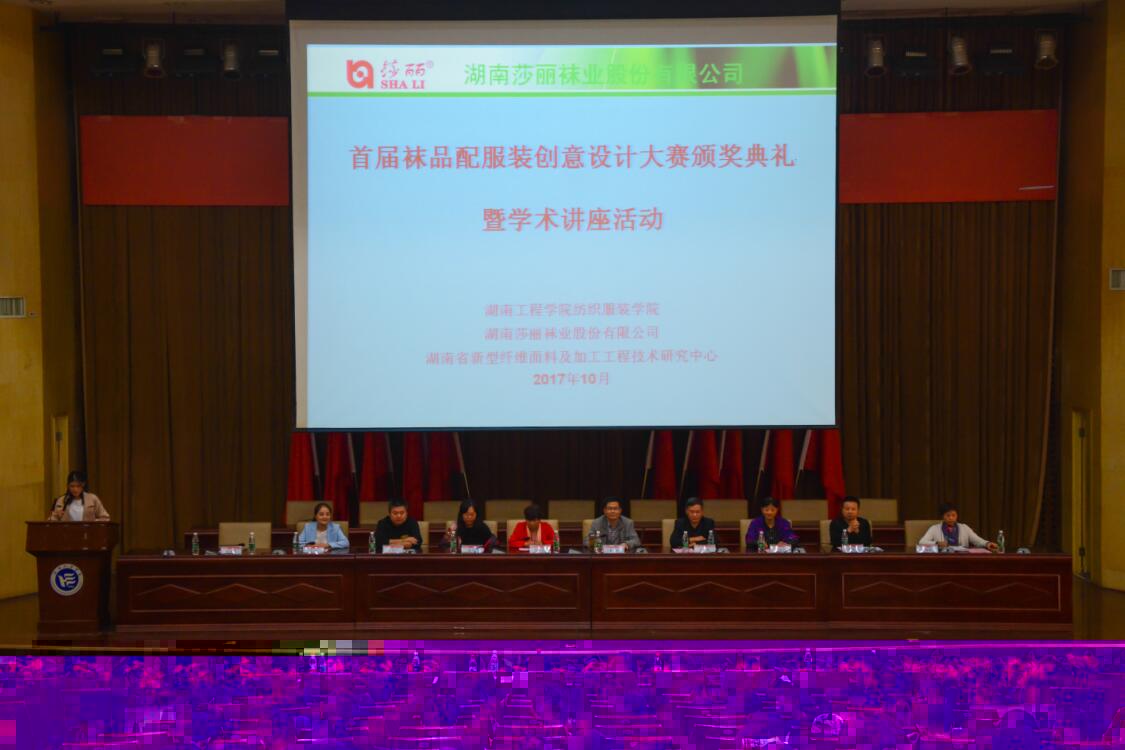 2017年10月23日下午,湖南莎麗襪業股份有限公司首屆襪品配服裝創意設計大賽頒獎儀式暨學術講座在tyc33455cc太阳成集团主校區第一報告廳隆重舉行。首屆襪品配服裝創意設計大賽以“一衣一襪”,“一足一衣”為主題,大賽旨在培養人才、創新産品、宣傳品牌;從征稿到評比,曆時5個多月,共收到132份稿件,參賽稿件緊扣大賽主題、創意新穎、時尚、實用,基本符合生産要求,為莎麗襪業培養人才、創新産品提供了新的途徑。