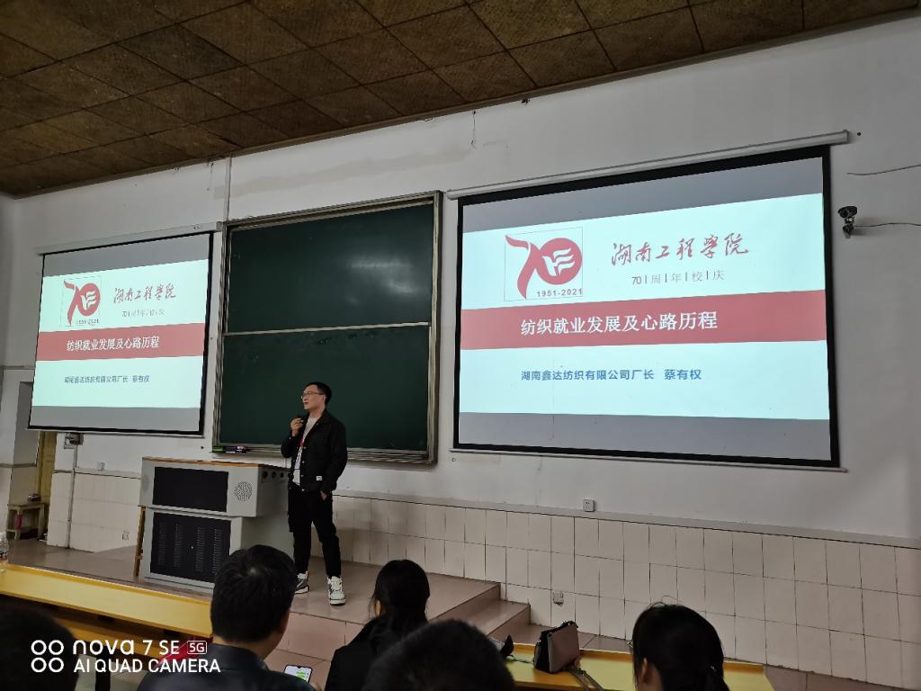 值此湖工70華誕之際,優秀校友代表、全體師生歡聚一堂。紡織工程教研室特别邀請了兩位優秀校友于2021年10月16日20:00-22:00在電教105教室給全體2021級紡織工程專業新生進行了經驗交流會,紡織工程專業譚冬宜老師、劉常威老師和羅鳳香老師也出席了本次經驗交流會。